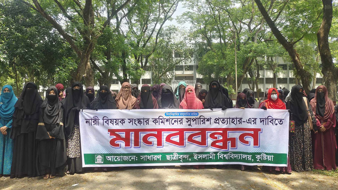নারী বিষয়ক সংস্কার কমিশনের সুপারিশ প্রত্যাহারের দাবিতে মানববন্ধন করেছে ইসলামী বিশ্ববিদ্যালয়ের (ইবি) নারী শিক্ষার্থীরা। গতকাল বিশ্ববিদ্যালয়ের অনুষদ ভবনের সামনে এ কর্মসূচি পালন করে তারা। শতাধিক নারী শিক্ষার্থী এ মানববন্ধনে অংশ নেন।