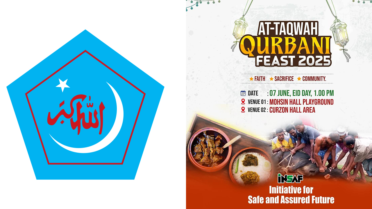 ইনসাফের পরিচালক ও ছাত্রশিবির ঢাকা বিশ্ববিদ্যালয়ের বিজ্ঞান সম্পাদক ইকবাল হায়দার জানান, ‘ঈদুল আজহার দিন দুপর ১টা থেকে বিকেল ৪টা পর্যন্ত বিশ্ববিদ্যালয়ের দু’টি ভেন্যু মুহসিন হল খেলার মাঠ ও কার্জন হলে আয়োজিত হবে আত ত্বাকওয়া কোবানি ফেস্ট ২০২৫। যেখানে আমরা পশু কোরবানি পরবর্তী মেজবানি দুপুরে অংশ নেব।’