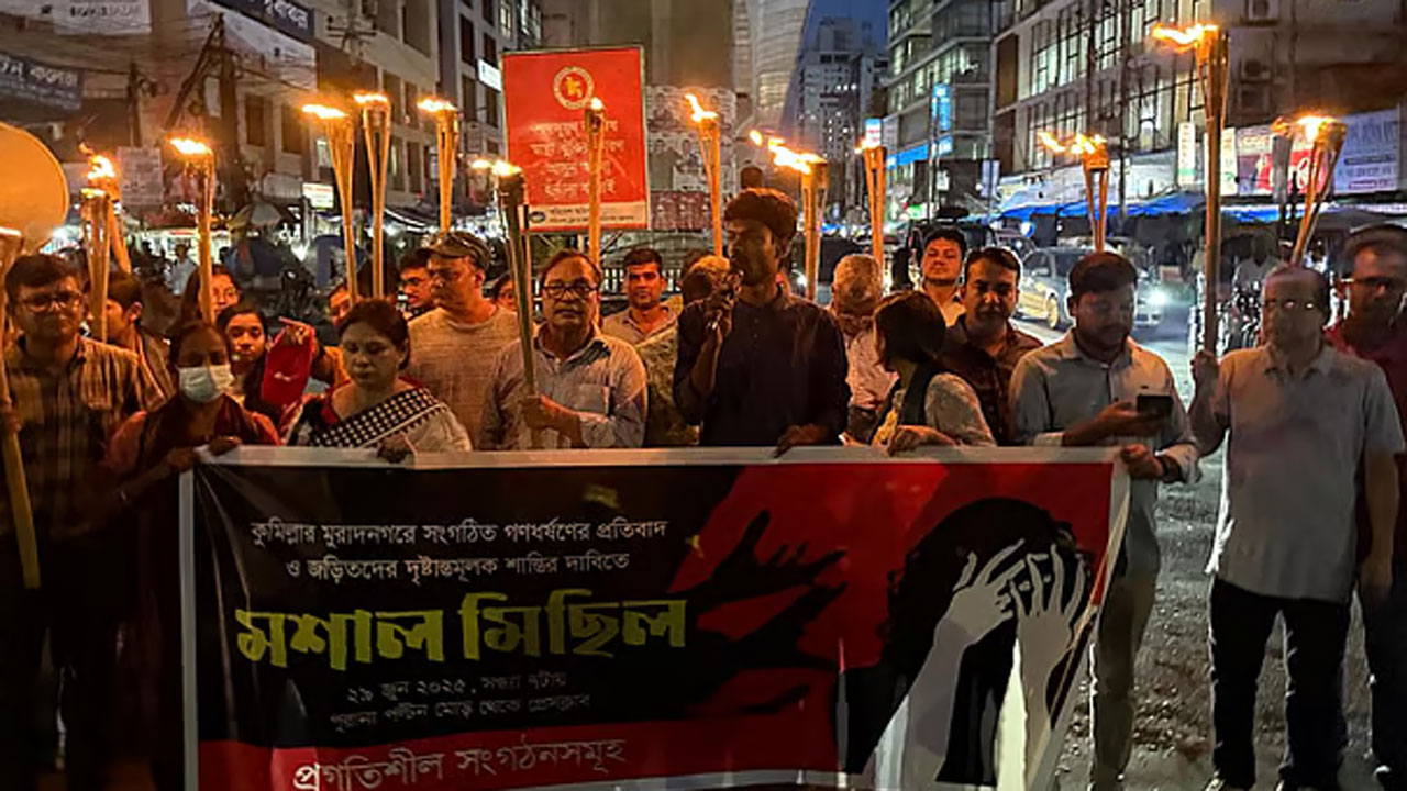 কুমিল্লার মুরাদনগরে এক নারীকে ধর্ষণ ও নিগ্রহের ঘটনায় জড়িত ব্যক্তিদের দৃষ্টান্তমূলক শাস্তির দাবিতে ঢাকা বিশ্ববিদ্যালয়ে মশালমিছিল করেছে গণতান্ত্রিক ছাত্র জোট। এ সময় অন্তর্বর্তী সরকার এ ঘটনার দায়ভার এড়াতে পারে না বলে মন্তব্য করেন গণতান্ত্রিক ছাত্র জোটের নেতারা।