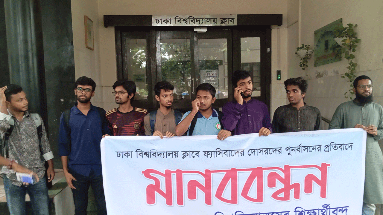 মানববন্ধনে ঢাবি শিক্ষার্থী এবি জুবায়ের বলেন, জুলাই গণঅভ্যুত্থানের এক বছর অতিক্রম হতে না হতেই ঢাকা বিশ্ববিদ্যালয়ের খুনি আওয়ামী লীগকে পুনর্বাসন করা হচ্ছে। ঢাবি ক্লাবের ১৫ জনের কমিটির ৭ জন নীল দলের, এটা সাদা দলের শিক্ষকদের জন্য লজ্জার। খুনি হাসিনাকে যারা বিভিন্ন ন্যারেটিভ তৈরি করে ফ্যাসিস্ট হতে সাহায্য করেছে, তাদের পুনর্বাসন করছে। তারা এর মাধ্যমে জুলাইয়ের আহত ও শহীদদের সাথে প্রতারণা করেছে। ক্ষতিয়ে দেখা হোক কোন স্বার্থে আওয়ামী দোসরদের পুনর্বাসন করা হচ্ছে।