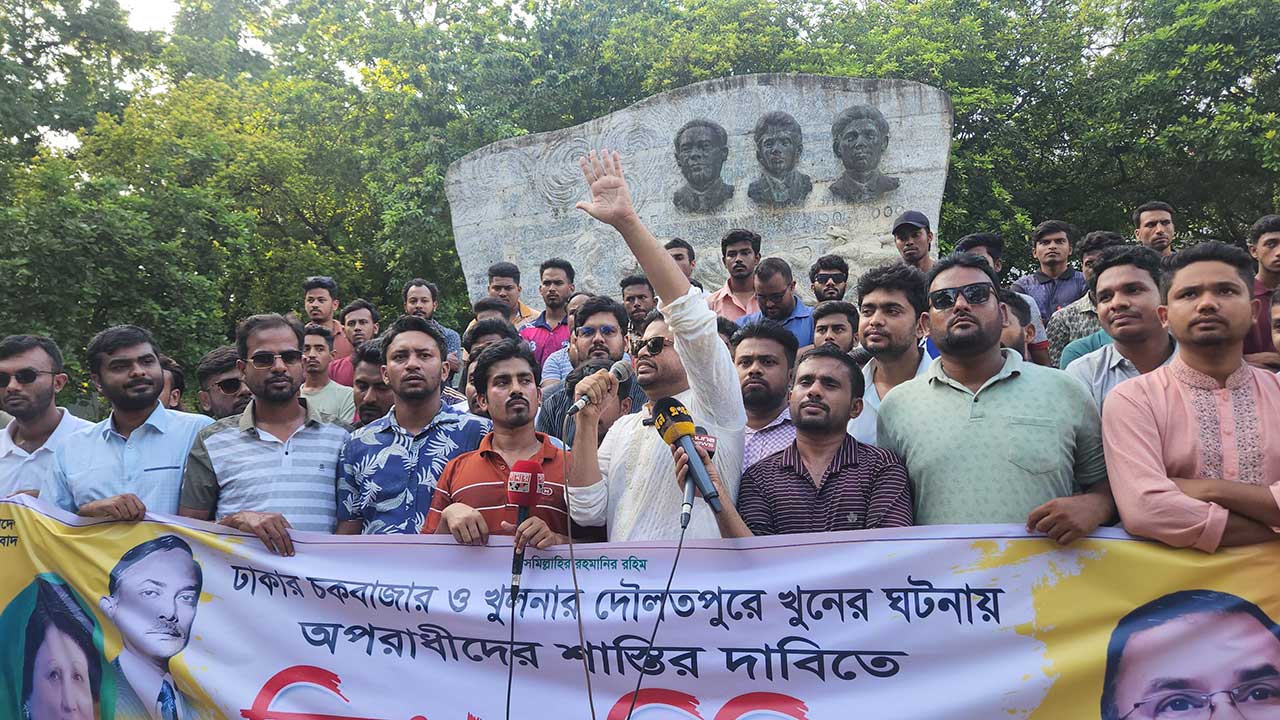 ঢাকার চকবাজার ও খুলনার দৌলতপুরে খুনের ঘটনায় অপরাধীদের দৃষ্টান্তমূলক শাস্তির দাবিতে বিক্ষোভ মিছিল করেছে রাজশাহী বিশ্ববিদ্যালয়(রাবি) শাখা ছাত্রদল।