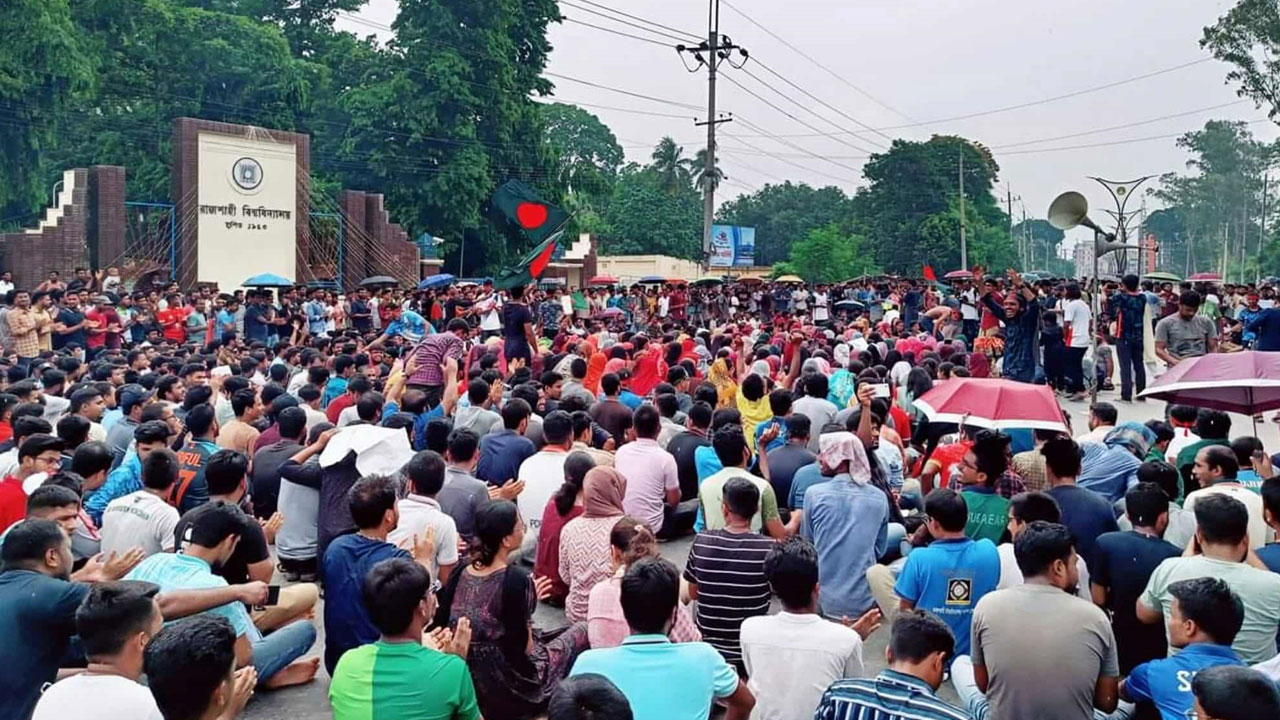 ১৬ জুলাই (২০২৪) দুপুর আড়াইটায় বিশ্ববিদ্যালয় সংলগ্ন বিনোদপুর থেকে দুই-আড়াইশোর মতো শিক্ষার্থী নিয়ে একটি দল বিশ্ববিদ্যালয়ের প্রধান গেট ভেঙে ভেতরে ঢুকে যায়। সেখানে প্রায় ১০০ জনের মতো পুলিশ থাকলেও তারা কোনো বাধা দেয়নি। সে সময় ছাত্রলীগের হাত থেকে প্রতিরোধের জন্য সবার হাতে ছিল রড, পাইপ ও লাঠিসোঁটা।
