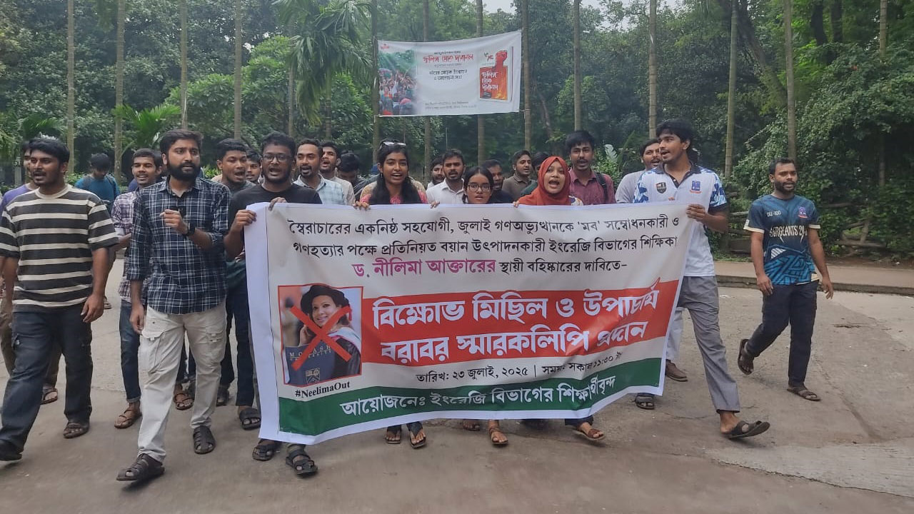ঢাকা বিশ্ববিদ্যালয়ের ইংরেজি বিভাগের সহযোগী অধ্যাপক ড. নীলিমা আক্তারের বিরুদ্ধে বিতর্কিত কর্মকাণ্ড, স্বৈরাচারের সহযোগী, জুলাই গণঅভ্যুত্থানকে ‘মব’ সম্বোধন ও গণহত্যার পক্ষে বয়ান দেওয়ার অভিযোগ এনে স্থায়ী বহিষ্কারের দাবিতে বিক্ষোভ মিছিল করেছে বিভাগটির শিক্ষার্থীরা।