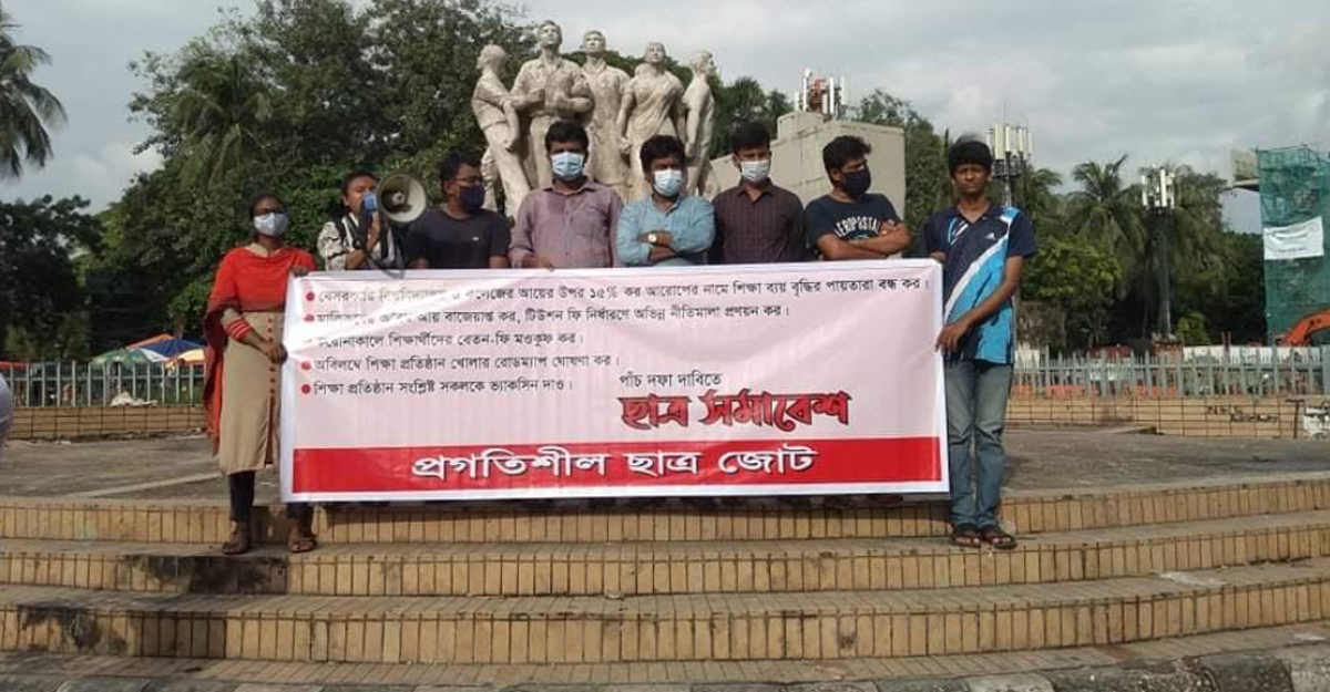 প্রগতিশীল ছাত্র জোটের দাবিগুলো হলো- বেসসরকারি বিশ্ববিদ্যালয় ও কলেজের ওপর ১৫ শতাংশ কর আরোপের নামে শিক্ষা ব্যয় বৃদ্ধির পাঁয়তারা বন্ধ করা, বেসরকারি বিশ্ববিদ্যালয়ের মালিকদের অবৈধ আয় বাজেয়াপ্ত ও টিউশন ফি নির্ধারণে অভিন্ন নীতিমালা প্রণয়ন, করোনাকালে বেতন ফি মওকুফ, শিক্ষার্থীদের ভ্যাকসিনের আওতায় আনা এবং শিক্ষা প্রতিষ্ঠান খোলার রোডম্যাপ ঘোষণা করা।