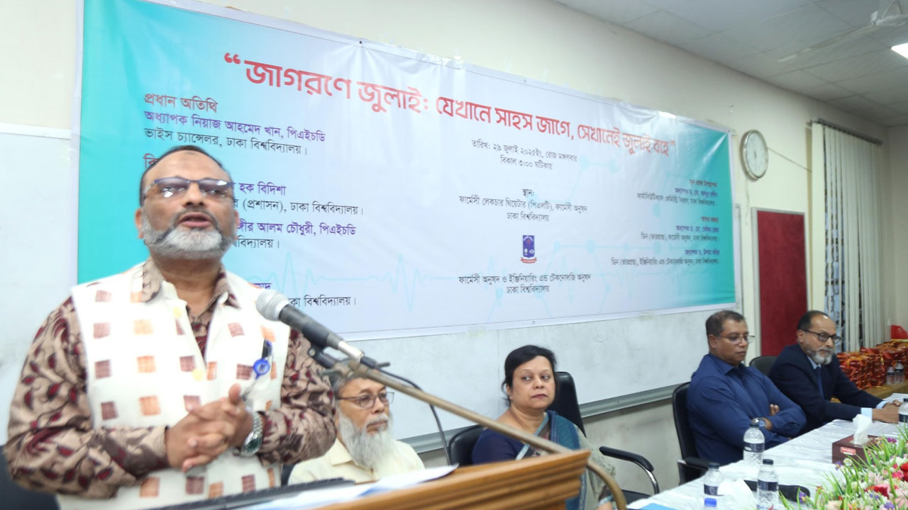আজ (মঙ্গলবার) ফার্মেসি লেকচার থিয়েটারে ঢাকা বিশ্ববিদ্যালয় ফার্মেসি অনুষদ এবং ইঞ্জিনিয়ারিং অ্যান্ড টেকনোলজি অনুষদের যৌথ উদ্যোগে “জাগরণে জুলাই: যেখানে সাহস জাগে, সেখানেই জুলাই বহে” শীর্ষক সেমিনারে প্রধান অতিথির বক্তব্যে তিনি এসব কথা বলেন।