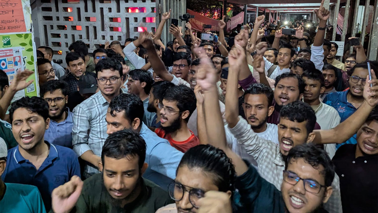 বামপন্থী শিক্ষার্থীরা ‘২৪ এর বাংলায়, রাজাকারের ঠাঁই নাই', ‘৭১ হারে নাই, হেরে গেছে স্বৈরাচার' ‘তোরা যারা রাজাকার, এই মুহূর্তে বাংলা ছাড়' প্রভৃতি স্লোগান দিতে থাকেন।