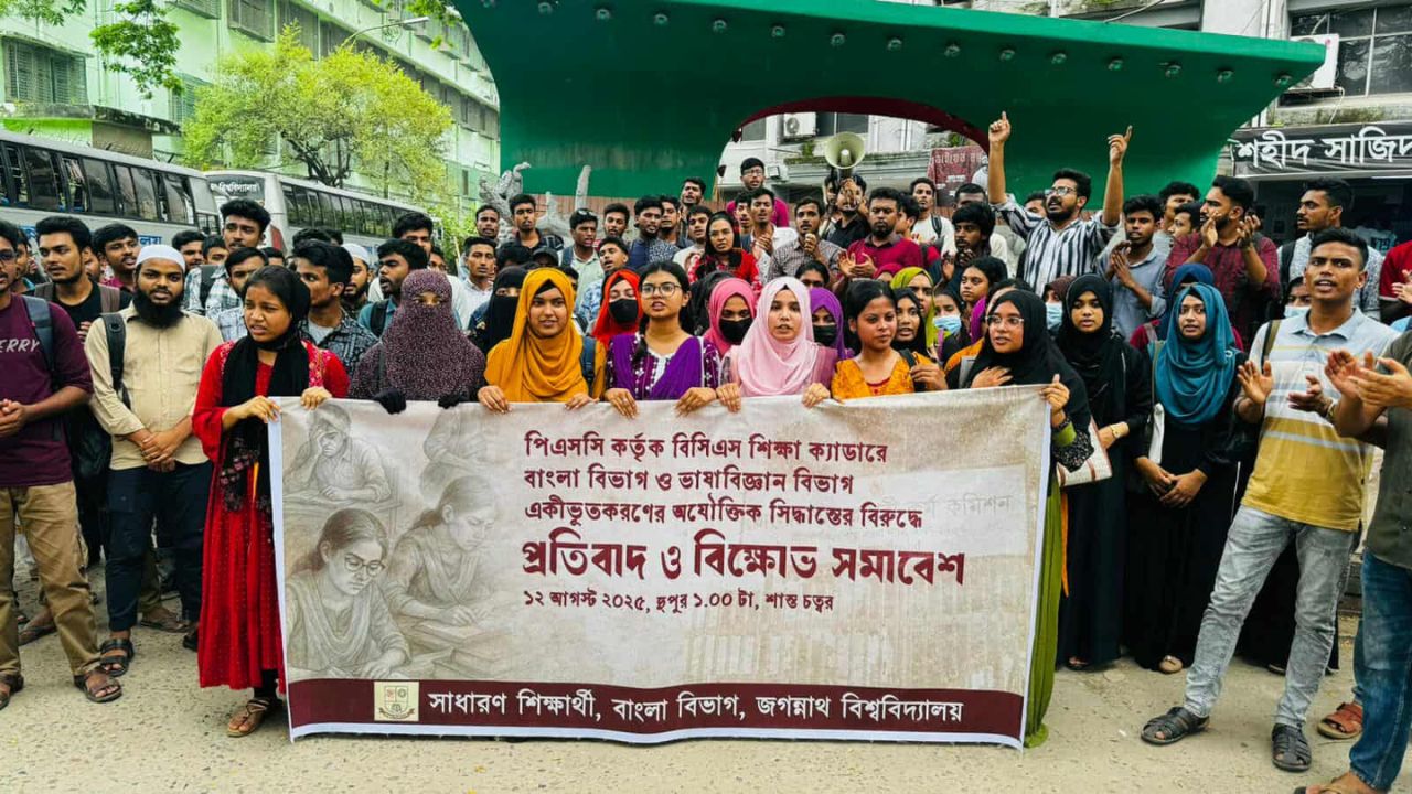 বাংলাদেশ সরকারি কর্ম কমিশন (পিএসসি) বিসিএস শিক্ষা ক্যাডারে বাংলা বিভাগ ও ভাষাবিজ্ঞান বিভাগকে একীভূত করার সিদ্ধান্তকে ‘অযৌক্তিক’ আখ্যা দিয়ে জগন্নাথ বিশ্ববিদ্যালয়ে (জবি) বিক্ষোভ সমাবেশ হয়েছে।
