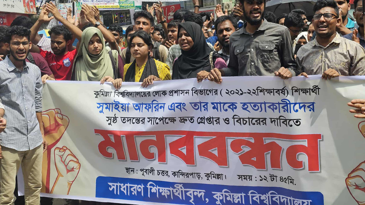 কুমিল্লা বিশ্ববিদ্যালয়ের শিক্ষার্থী সুমাইয়া আফরিন ও তার মা তাহমিনা বেগমের হত্যাকারীদের গ্রেপ্তার ও বিচারের দাবিতে মানববন্ধন করেছে বিশ্ববিদ্যালয়ের লোকপ্রশাসন বিভাগের শিক্ষার্থীরা।