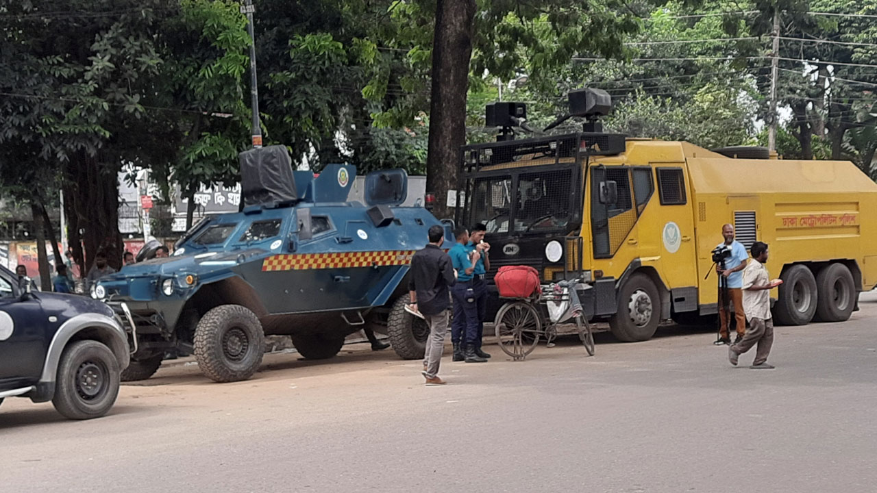 ঢাকা বিশ্ববিদ্যালয়ের টিএসসি, ফুলার রোড, ভিসি চত্বর ঘুরে দেখা গেছে, পুরো এলাকা নিস্তব্ধ। সবসময় যেখানে আড্ডায় মুখর থাকে শিক্ষার্থীরা, সেখানে আজ পুলিশ সদস্যরা বসে আছেন সারিবদ্ধভাবে। টিএসসির পাশের সড়কে পাশে রাখা হয়েছে জলকামান ও এপিসি।