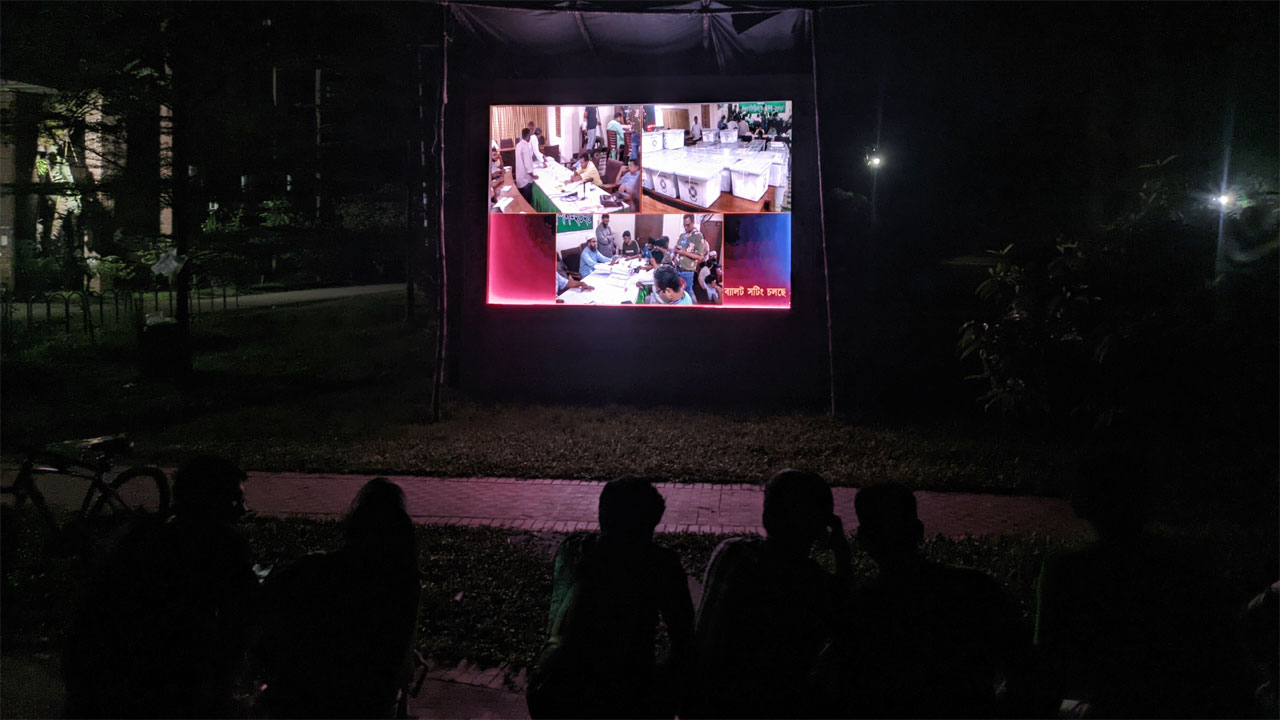 সরেজমিনে দেখা গেছে, বিশ্ববিদ্যালয়ের নতুন কলা ভবনের সামনে মহুয়া মঞ্চের পাশে, বটতলায়, অদম্য ২৪ ম্মৃতিস্তম্ভের সামনে ও প্রীতিলতা হলের সমনে মোট চারটি পয়েন্টে স্থাপিত এলইডি স্ক্রিনে সরাসরি দেখানো হচ্ছে ভোট গণনা।