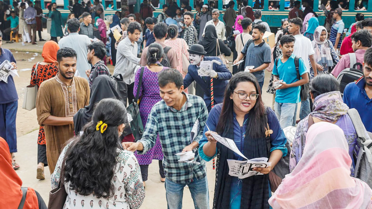 শারীরিক শিক্ষা ও স্পোর্টস সায়েন্স বিভাগের শিক্ষার্থী নিবেদিত নিতু বলেন, দুপুর থেকেই ভিড় ছিল, কিন্তু রাতে দাঁড়ানোর জায়গা ছিল না। শাটল ট্রেন আসার পর স্টেশন যেন উৎসবে পরিণত হয়। প্রার্থীরা শেষ মুহূর্ত পর্যন্ত শিক্ষার্থীদের নিজেদের পক্ষে টানতে চেষ্টা করছেন।