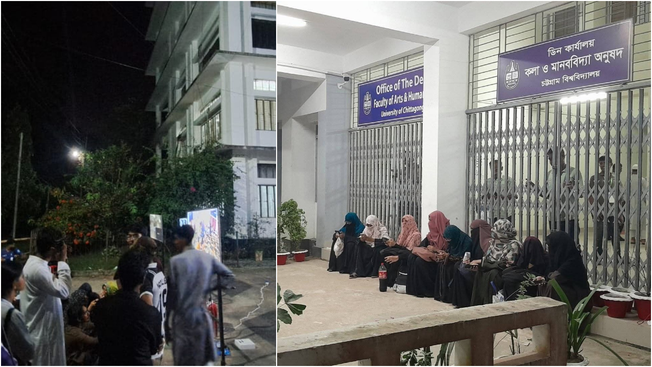 বুধবার (১৫ অক্টোবর) রাত ৮টার পর সরেজমিনে বিশ্ববিদ্যালয়ের কলা এবং সমাজ বিজ্ঞান অনুষদ ভবনের সামনে গিয়ে দেখা যায়, চারপাশে টানটান উত্তেজনা।