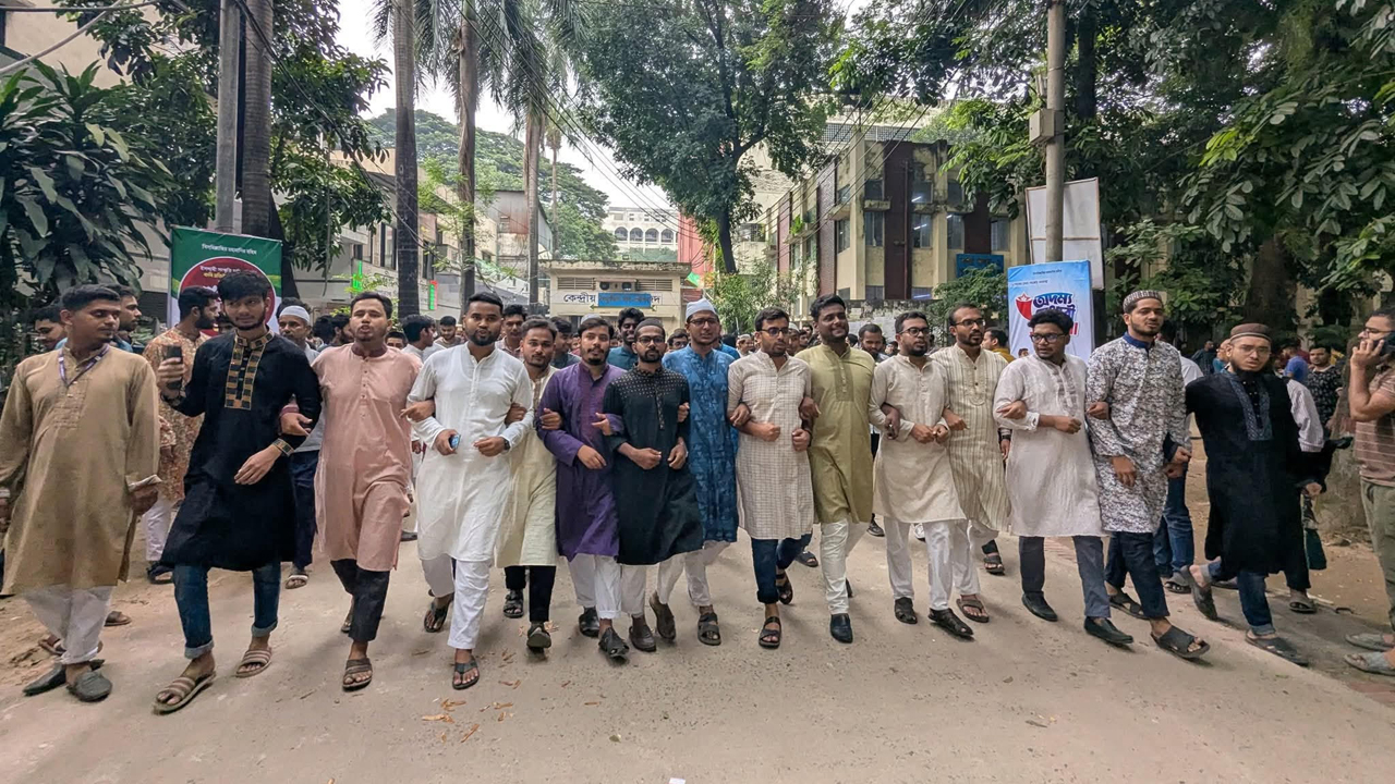 শুক্রবার (১৭ অক্টোবর) বাদ জুমা বিশ্ববিদ্যালয়ের কেন্দ্রীয় মসজিদ থেকে মিছিলটি শুরু হয়ে পুরো ক্যাম্পাস প্রদক্ষিণ করে ভিক্টোরিয়া পার্কসংলগ্ন বিশ্বজিৎ চত্বরে এক সংক্ষিপ্ত সমাবেশের মাধ্যমে শেষ হয়।