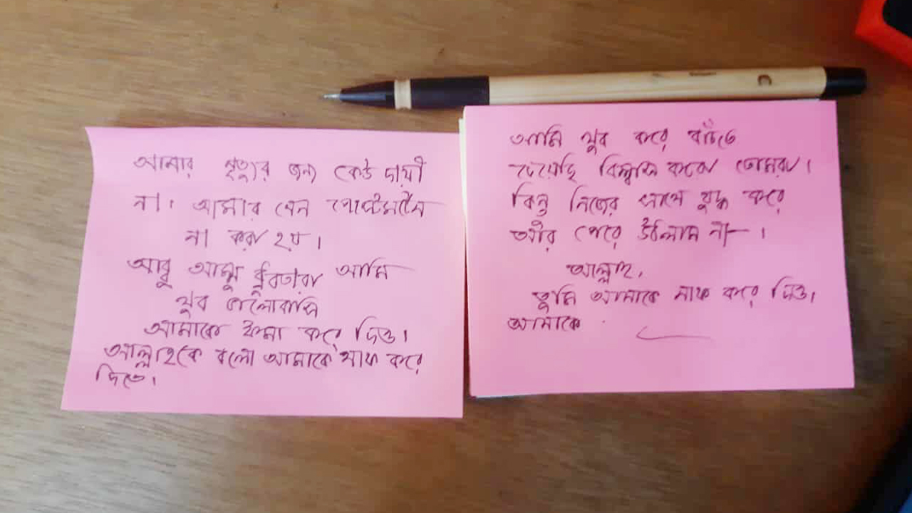 অন্য চিরকুটে লেখা ছিল, আমি খুব করে বাঁচতে চেয়েছি, বিশ্বাস করো তোমরা। কিন্তু নিজের সঙ্গে যুদ্ধ করে আর পেরে উঠলাম না। আল্লাহ, তুমি আমাকে মাফ করে দিও।