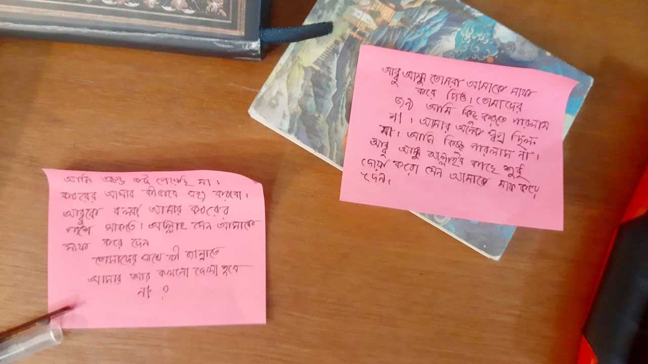 অন্য একটি চিরকুটে লেখা ছিল-আমি খুব করে বাঁচতে চেয়েছি বিশ্বাস করো তোমরা। কিন্তু নিজের সাথে যুদ্ধ করে আর পেরে উঠলাম না। আল্লাহ তুমি আমাকে মাফ করে দিও।