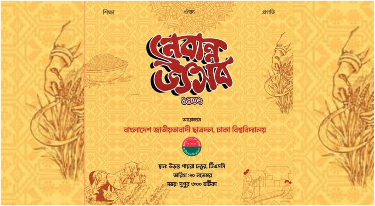 ঢাকা বিশ্ববিদ্যালয় শাখা ছাত্রদলের উদ্যোগে অনুষ্ঠিত হতে যাচ্ছে নবান্ন উৎসব ১৪৩২। উৎসব ও সাংস্কৃতিক এই আয়োজনটি আজ ৫ অগ্রহায়ণ ১৪৩২ (২০ নভেম্বর) বিকেল ৩টায় টিএসসির উড়ন্ত পায়রা চত্বরে অনুষ্ঠিত হবে।