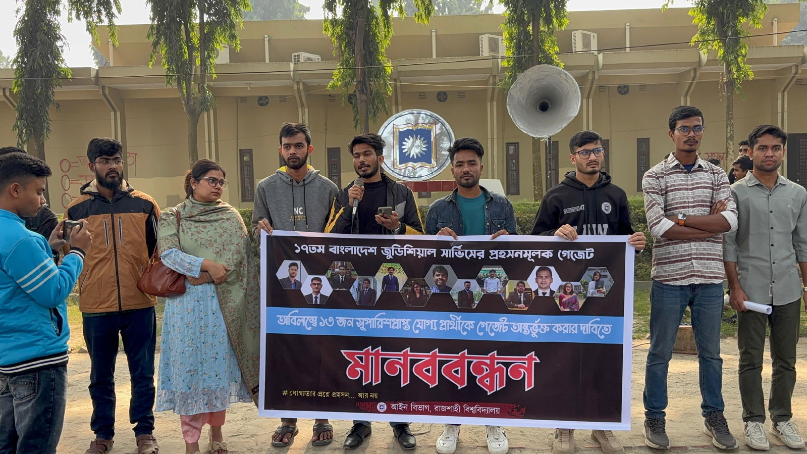 ১৭তম বাংলাদেশ জুডিশিয়াল সার্ভিস (বিজেএস) পরীক্ষায় গেজেট থেকে বঞ্চিত ১৩ জন সুপারিশপ্রাপ্ত প্রার্থীর গেজেটভুক্তির দাবিতে মানববন্ধন করেছেন রাজশাহী বিশ্ববিদ্যালয়ের (রাবি) আইন বিভাগের শিক্ষার্থীরা। মঙ্গলবার (২ ডিসেম্বর) দুপুর ১২টায় বিশ্ববিদ্যালয়ের প্যারিস রোডে এই মানববন্ধনের আয়োজন করা হয়।