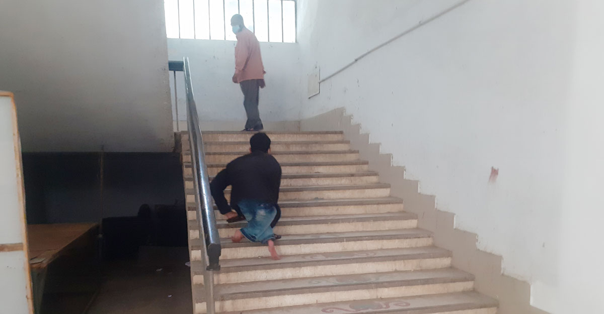 ইসলামী বিশ্ববিদ্যালয়ে পরীক্ষা কেন্দ্রে সিঁড়ি বেয়ে উঠছেন প্রতিবন্ধী ওহিদুর