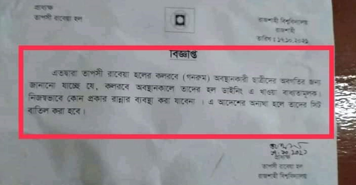 এতে বলা হয়েছে, হলটির একটি গণরুমে (কলরব) থাকাকালে কোনো ছাত্রী নিজস্বভাবে কোনো খাবার রান্না করতে পারবে না। তবে আদেশ শুধুমাত্র গণরুমের শিক্ষার্থীদের জন্য। ব্লকে থাকা শিক্ষার্থীরা নিজেরা রান্না করতে পারছেন।