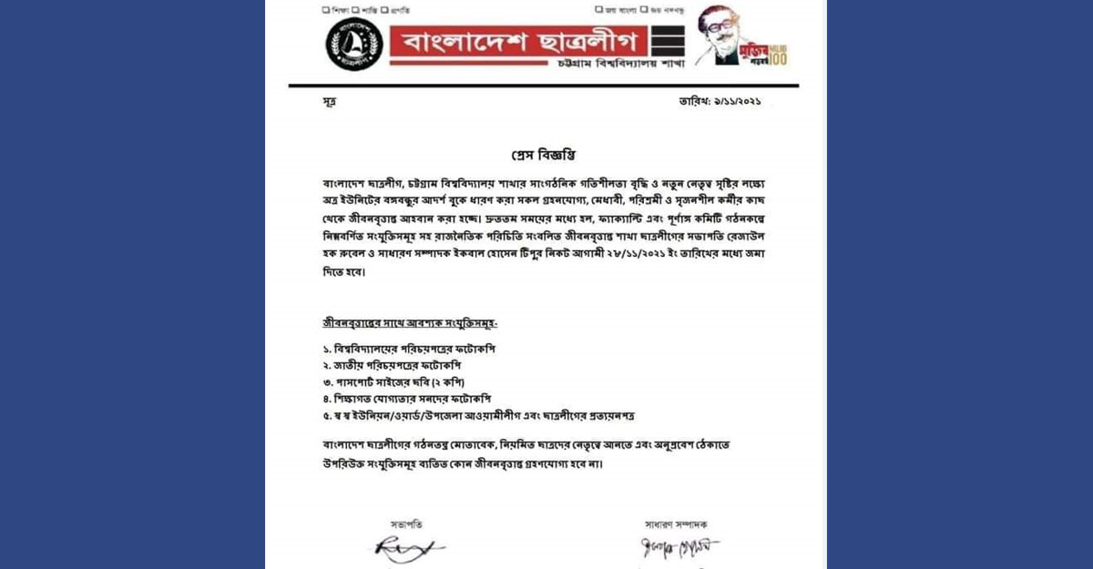 চবি ছাত্রলীগের পূর্ণাঙ্গ কমিটির জন্য জীবনবৃত্তান্ত আহ্বান