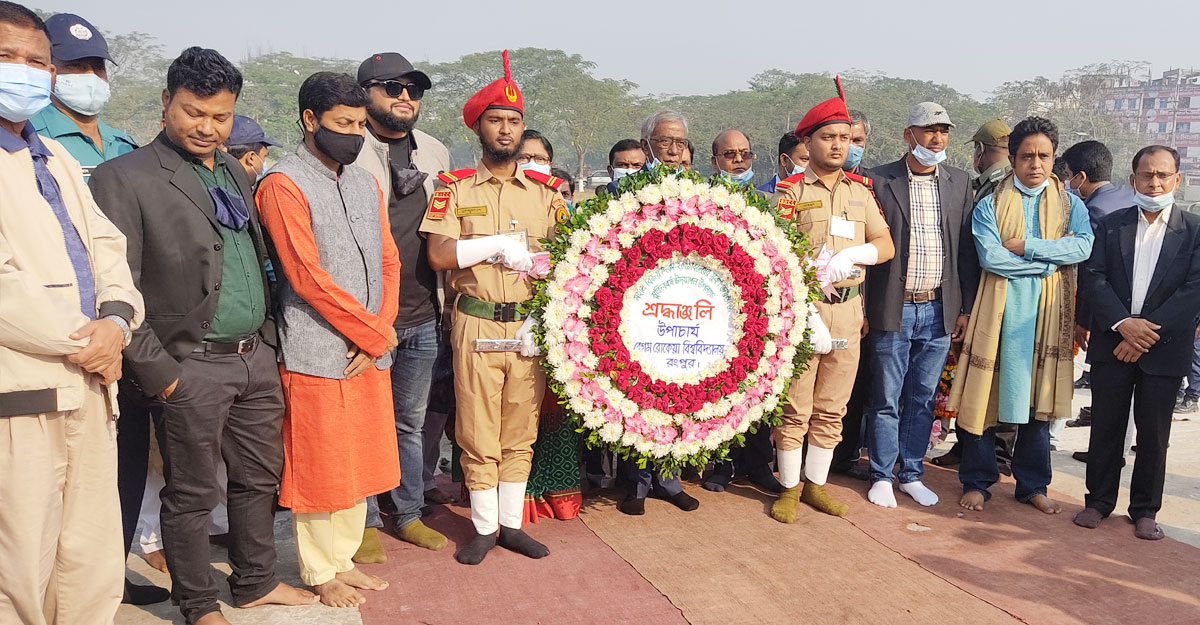 সকাল সাড়ে ৯টায় বিশ্ববিদ্যালয়ের স্বাধীনতা স্মারকে মহান মুক্তিযুদ্ধে শহিদদের প্রতি শ্রদ্ধা নিবেদন করে শ্রদ্ধাঞ্জলি অর্পণ করেন উপাচার্য অধ্যপক ড. হাসিবুর রশীদ ও উপ-উপাচার্য অধ্যাপক ড. সরিফা সালোয়া ডিনা। এরপর বিভিন্ন অনুষদের ডিন, বিভিন্ন বিভাগ, বেগম রোকেয়া বিশ্ববিদ্যালয় সাংবাদিক সমিতি, শিক্ষক সমিতি, অফিসার্স অ্যাসোসিয়েশন, কর্মচারী ইউনিয়ন, বেরোবি শাখা ছাত্রলীগ, শিক্ষক-শিক্ষার্থী, কর্মকর্তা-কর্মচারীদের অন্যান্য সংগঠনের পক্ষ থেকেও পৃথকভাবে শ্রদ্ধাঞ্জলি অর্পণ করা হয়।