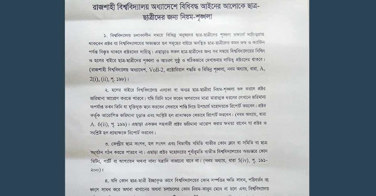 শিক্ষার্থীদের জন্য নিয়ম-শৃঙ্খলা সংক্রান্ত ১৭টি নির্দেশনা দিয়েছেন রাজশাহী বিশ্ববিদ্যালয়ের প্রক্টর। নির্দেশনা সম্বলিত নোটিশে উল্লেখ করা হয় ১৯৭৩-এর অধ্যাদেশ অনুযায়ী এসব নির্দেশনা দেওয়া হয়েছে। তবে, শিক্ষার্থীদের দাবি, ৭৩-এর অধ্যাদেশে এসব বিষয় উল্লেখ নেই, শিক্ষার্থীদের চাপে রাখতেই এসব নির্দেশনা দেওয়া হয়েছে।
