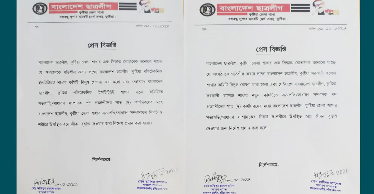 একই সঙ্গে কুষ্টিয়া সরকারি কলেজ ও কুষ্টিয়া পলিটেকনিক কলেজ ছাত্রলীগের নতুন কমিটিতে সভাপতি ও সম্পাদক পদে আগ্রহী পদপ্রত্যাশীদের থেকে আগামী সাত কার্যদিবসের মধ্যে জীবনবৃত্তান্ত আহ্বান করা হয়েছে। জেলা ছাত্রলীগের সভাপতি অথবা সাধারণ সম্পাদকের নিকট স্ব-শরীরে উপস্থিত হয়ে জীবনবৃত্তান্ত জমা দেওয়ার জন্য বিজ্ঞপ্তিতে নির্দেশ দেওয়া হয়েছে।