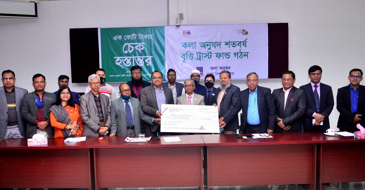 ট্রাস্ট ফান্ডটি গঠনের লক্ষ্যে কলা অনুষদের ডিন অধ্যাপক ড. আবু মো. দেলোয়ার হোসেন ১ কোটি টাকার একটি চেক মঙ্গলবার (৪ জানুয়ারি) ঢাকা বিশ্ববিদ্যালয়ের উপাচার্য অধ্যাপক ড. মো. আখতারুজ্জামানের কাছে হস্তান্তর করেন।