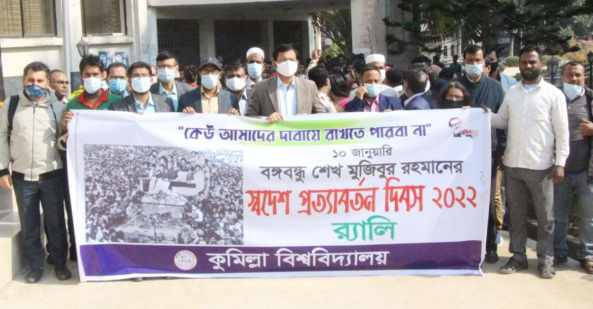 জাতির পিতা বঙ্গবন্ধু শেখ মুজিবুর রহমানের স্বদেশ প্রত্যাবর্তন দিবস পালন করেছে কুমিল্লা বিশ্ববিদ্যালয়। সোমবার (১০ জানুয়ারি) সকাল সাড়ে ১০টায় র্যালি বের করার মাধ্যমে এ দিনের আনুষ্ঠানিকতা শুরু হয়।
