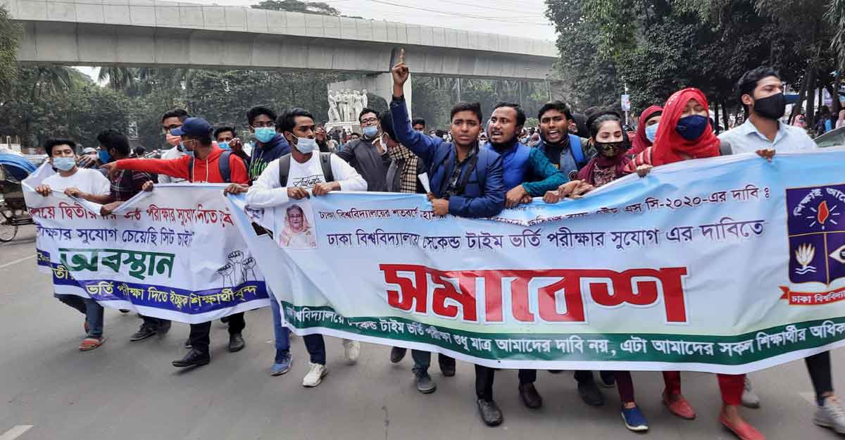 ঢাকা বিশ্ববিদ্যালয়ে (ঢাবি) দ্বিতীয়বার ভর্তি পরীক্ষার সুযোগের দাবিতে বিক্ষোভ মিছিল ও অবস্থান কর্মসূচি পালন করছেন ২০২০ সালের এইচএসসি পরীক্ষার্থীরা।