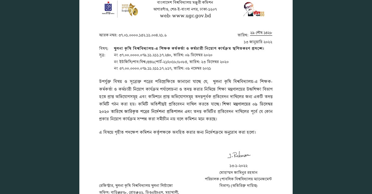 খুলনা কৃষি বিশ্ববিদ্যালয়ের রেজিস্ট্রারকে ওই চিঠিতে উল্লেখ করা হয়েছে, খুলনা কৃষি বিশ্ববিদ্যালয়ের শিক্ষক, কর্মকর্তা ও কর্মচারী নিয়োগ কার্যক্রম পর্যালোচনা ও তদন্ত করার জন্য শিক্ষা মন্ত্রণালয়ের উচ্চ বিভাগ থেকে প্রাপ্ত অভিযোগসমূহ এবং কমিশনে প্রাপ্ত অভিযোগসমূহ তদন্তপূর্বক প্রতিবেদন দাখিলের জন্য একটি তদন্ত কমিটি গঠন করা হয়। কমিটি শিগগিরই তদন্ত প্রতিবেদন দাখিল করতে যাচ্ছে।