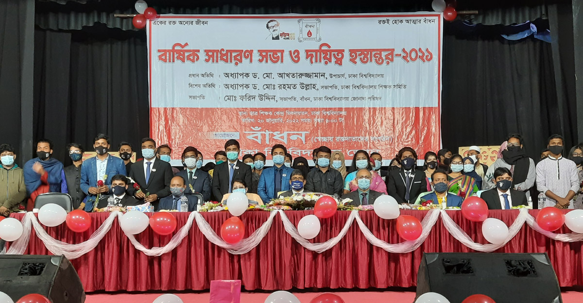 স্বেচ্ছায় রক্তদাতাদের সংগঠন বাঁধন ঢাকা বিশ্ববিদ্যালয় (ঢাবি) জোনের বার্ষিক সাধারণ সভা ও দায়িত্ব হস্তান্তর-২০২১ অনুষ্ঠিত হয়েছে। বৃহস্পতিবার (২০ জানুয়ারি) সন্ধ্যায় বিশ্ববিদ্যালয়ের ছাত্র শিক্ষক কেন্দ্রে (টিএসসি) অডিটরিয়ামে এ অনুষ্ঠানের আয়োজন করা হয়।