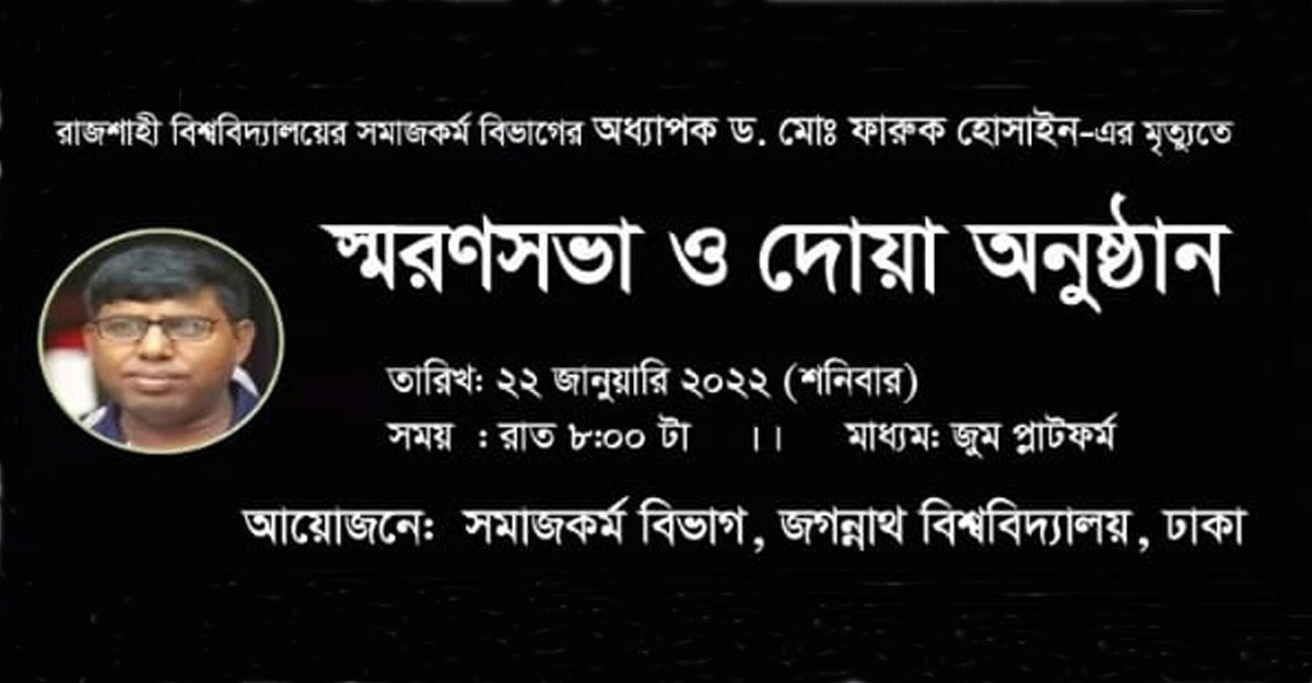 শনিবার (২২ জানুয়ারি) রাতে জগন্নাথ বিশ্ববিদ্যালয়ের (জবি) সমাজকর্ম বিভাগের উদ্যোগে ভার্চুয়ালি এ স্মরণসভা অনুষ্ঠিত হয়। বিভাগের চেয়ারম্যান প্রফেসর ড. রাজিনা সুলতানা সভায় সভাপতিত্ব করেন