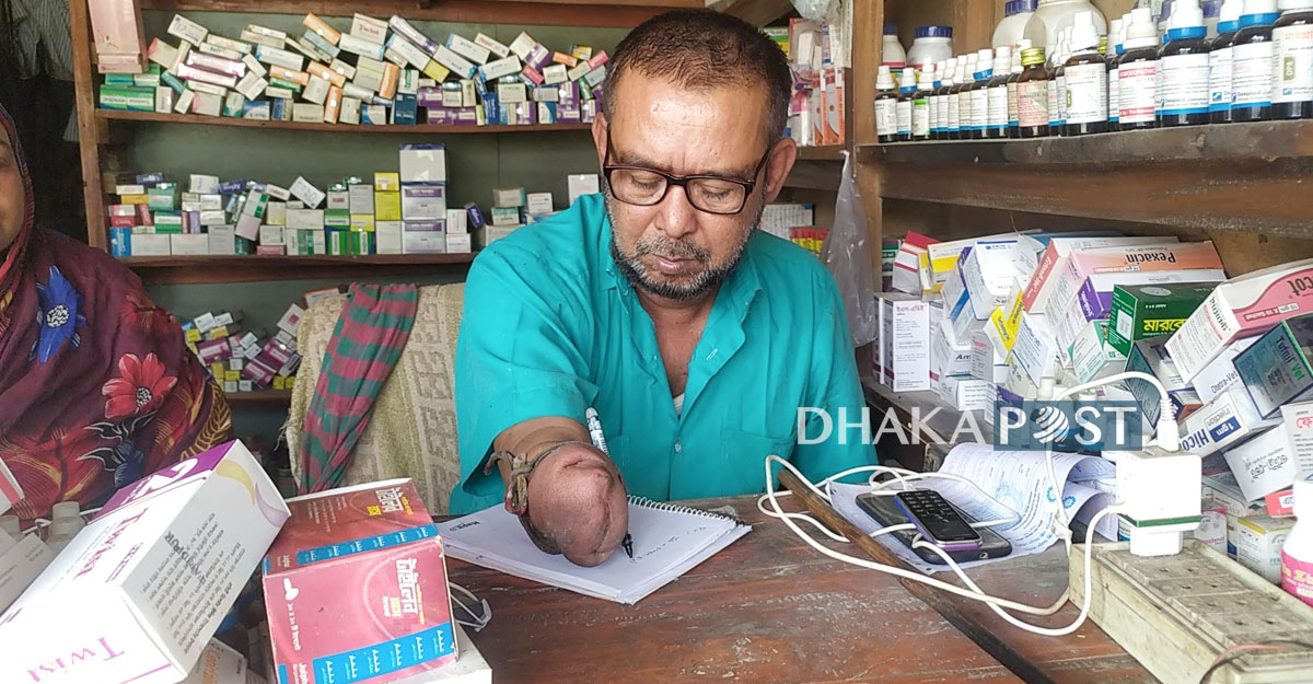 ১৪ ফুট দৈর্ঘ্য ও ৮ ফুট প্রস্থের একটি কক্ষ। চারপাশে ইটের দেয়াল, ওপরে টিনের চাল। কক্ষটির ভেতরে তিনটি কাঠের আলমারি। সেখানে সারিবদ্ধভাবে থরে থরে সাজানো রয়েছে বিভিন্ন ধরনের ওষুধ। দোকানে গদিযুক্ত একটি ফোমের চেয়ারে বসে আছেন প্রবীণ এক ব্যক্তি। তার পাশে একটি প্লাস্টিকের চেয়ারে বসা মধ্যবয়সী এক নারী।