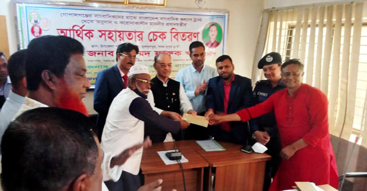 সাংবাদিক কল্যাণ ট্রাস্ট থেকে প্রাপ্ত গোপালগঞ্জে কর্মরত ৫০ জনকে ১০ হাজার টাকা করে ৫ লাখ এবং একজনকে ১ লাখ টাকাসহ সর্বমোট ৬ লাখ টাকার আর্থিক অনুদানের চেক প্রদান করা হয়।
