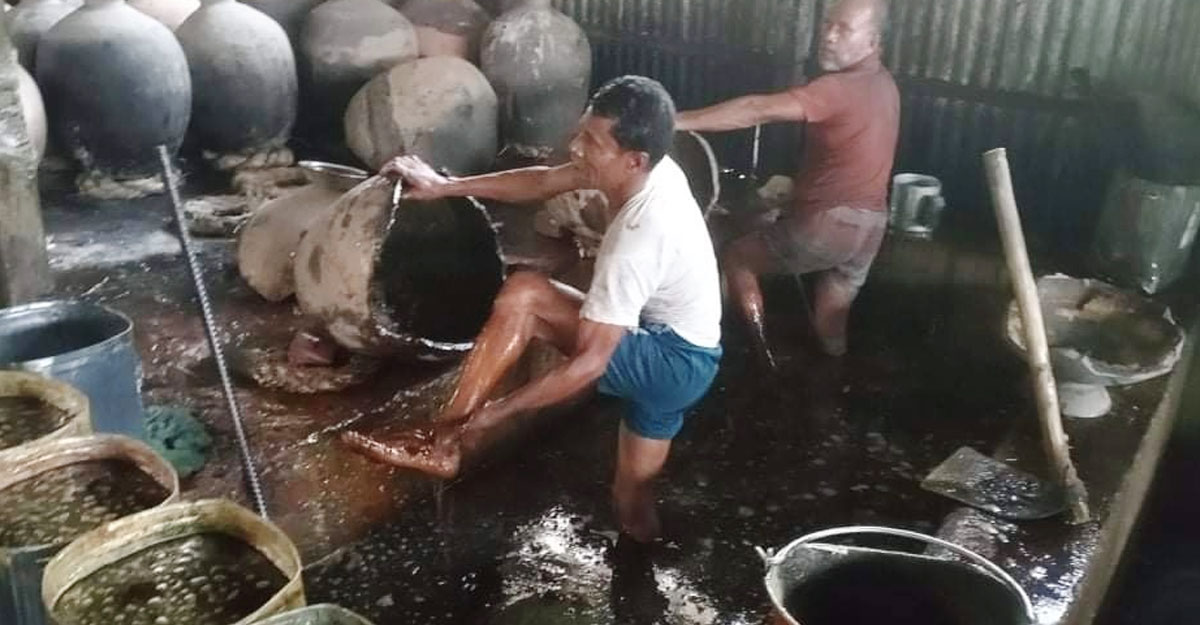 পা দিয়ে চিনি-রং-সোডা মিশিয়ে তৈরি করা হচ্ছে গুড়