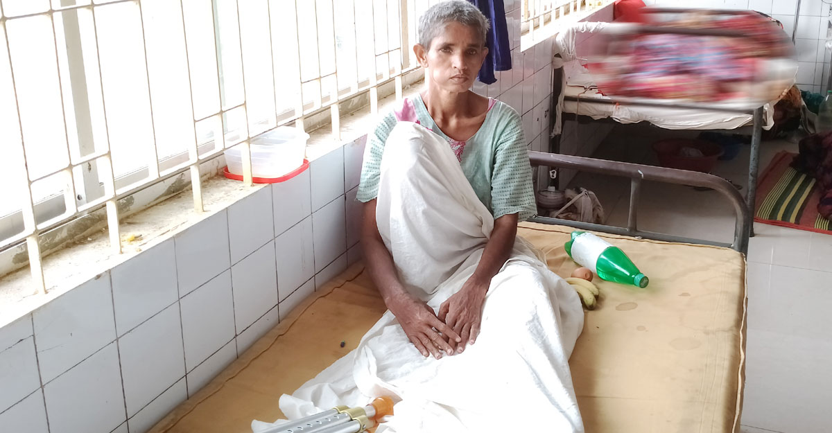 সরেজমিনে হাসপাতালে দেখা যায়, যশোর জেনারেল হাসপাতালের মহিলা সার্জারি ওয়ার্ডে জানালার পাশে ৫ নম্বর বেডে বসে আছেন ষাটোর্ধ্ব ওই নারী। আধখোলা চোখে ময়লা জমে আছে। সারা শরীরেই ছোপ ছোপ ময়লা। বা পায়ে সাদা ব্যান্ডেজ। বেডে দুটি কলা, একটি সিদ্ধ ডিম আর কয়েকটি ওষুধের খালি খোসা পড়ে রয়েছে। তার দিকে ক্যামেরা তাক করতেই ধীরে ধীরে চোখ মেলে তাকান।