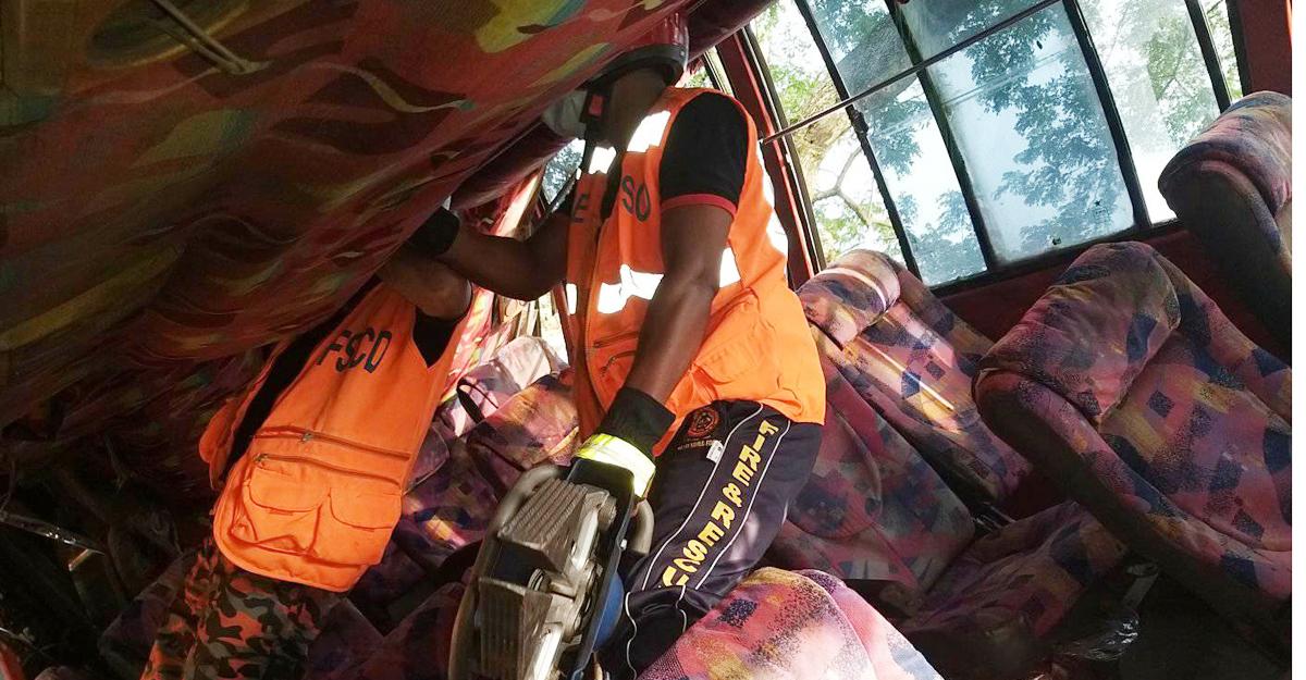 দুর্ঘটনাকবলিত বাসে ফায়ার সার্ভিস কর্মীদের উদ্ধার অভিযান