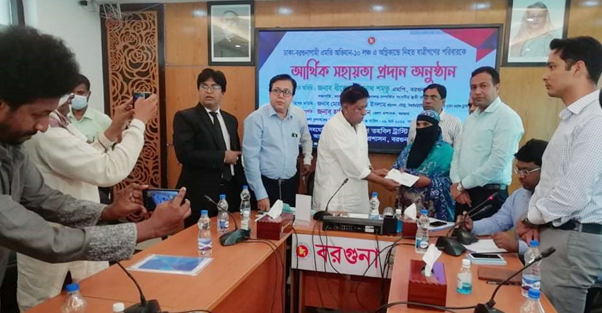 বরগুনার অতিরিক্ত জেলা প্রশাসক পিযুষ চন্দ্র দেবের সভাপতিত্বে সহায়তা প্রদান অনুষ্ঠানে প্রধান অতিথি হিসেবে উপস্থিত ছিলেন বরগুনা-১ আসনের সংসদ সদস্য ধীরেন্দ্র দেবনাথ শম্ভু। বিশেষ অতিথি ছিলেন বাংলাদেশ অভ্যন্তরীণ নৌ পরিবহন কর্তৃপক্ষের নৌ-নিট্রা বিভাগের পরিচালক মোহাম্মদ রফিকুল ইসলাম। অনুষ্ঠানে নৌ দুর্যোগ তহবিল ট্রাস্টের পক্ষে প্রতিনিধিত্ব করেন বরগুনা নদী বন্দর কর্মকর্তা মামুনুর রশীদ।