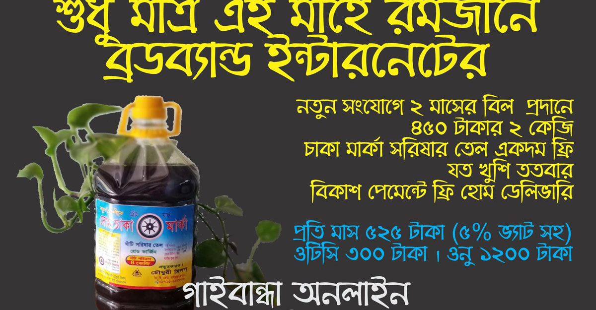 সারাদেশে তেলের ঊর্ধ্বগতির সময় গাইবান্ধায় ইন্টারনেট বিল দিলে বিনা মূল্যে দুই লিটার সরিষার তেল দেওয়া হচ্ছে। অফারটি লুফে নিতে নতুন সংযোগ গ্রহণকারীর সংখ্যা বাড়ছে। রমজান উপলক্ষে এমন চমকপ্রদ অফার দিয়েছে ‘গাইবান্ধা অনলাইন’ নামে একটি ইন্টারনেট সংযোগ প্রতিষ্ঠান।