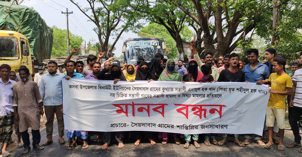 মানববন্ধনে বক্তারা বলেন, সৈয়দাবাদ গ্রামের মৃত শহীদুল হক খানের ছেলে এনামুল হক খান সন্ত্রাসী বাহিনী গড়ে তুলে গ্রামের সাধারণ মানুষের ওপর অত্যাচার করে আসছেন। গত ৩০ মার্চ গ্রামের বাজারে দলবলসহ দেশীয় অস্ত্রশস্ত্র নিয়ে মৃত আব্দুর রউফ ভূইয়ার ছেলেদের হার্ডওয়্যার সামগ্রীর দোকানে গিয়ে চাঁদা দাবি করেন এনামুল। চাঁদা না দেওয়ায় দোকানে হামলা চালিয়ে আব্দুর রউফ ভূইয়ার ছেলে নোমান ভূইয়াকে মেরে রক্তাক্ত করা হয়। এ ঘটনার পর উল্টো নোমান ভূইয়াসহ তার ভাইদের মিথ্যা মামলায় ফাঁসিয়ে দেন এনামুল। ওই মামলা প্রত্যাহারসহ হামলার ঘটনায় এনামুলের দৃষ্টান্তমূলক শাস্তি দাবি করেন বক্তারা।
