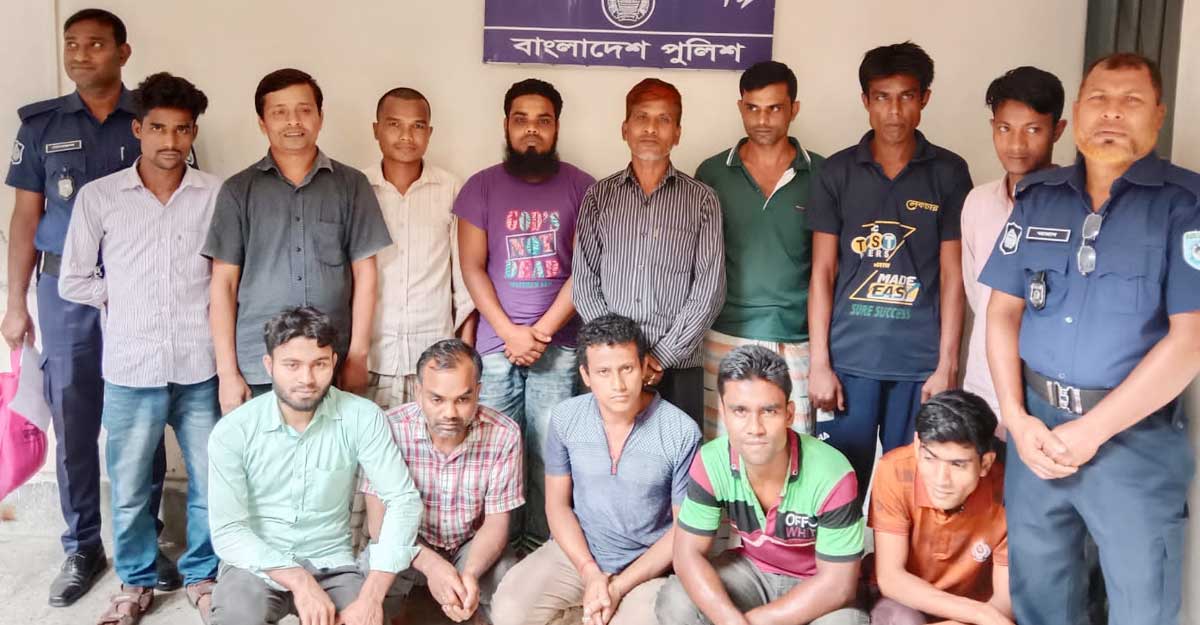 গ্রেপ্তাররা হলেন- রুবেল মিয়া (২৫), কমল চন্দ্র (৩১), মমিনুল হক (২৯), প্রদীপ কুমার বর্মন (৩২), হযরত আলী (২৬), শাহাজাহান মিয়া (২৮), বিপুল মিয়া (৩৭), আব্দুল মজিদ (৪০), আবু তাহের (২৬), আশরাফুল ইসলাম (৩০), এমদাদুল হক (৩৫), বিপ্লব রায় (২২) ও মো. আলহাজ আলী (৩৫)।