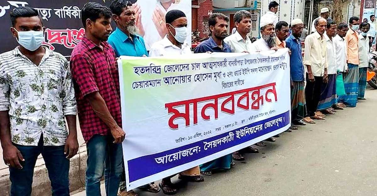 জেলেদের বরাদ্দের চাল আত্মসাৎ ও টাকার বিনিময়ে জেলে কার্ড বিতরণের প্রতিবাদে বানারীপাড়া উপজেলার সৈয়দকাঠী ইউনিয়নের জেলে সম্প্রদায় এই কর্মসূচি পালন করে।