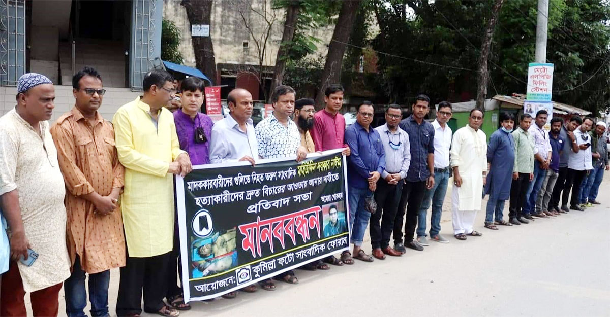 কুমিল্লায় সংবাদকর্মী মহিউদ্দিন হত্যারকারীদের দৃষ্টান্তমূলক শাস্তির দাবিতে মানববন্ধন ও প্রতিবাদ সভা অনুষ্ঠিত হয়েছে। শুক্রবার (১৫ এপ্রিল) বেলা সাড়ে ১১টায় কুমিল্লা প্রেসক্লাবের সামনে কুমিল্লা ফটোসাংবাদিক ফোরাম ও বুড়িচং প্রেসক্লাবের সাংবাদিকরা মানববন্ধনে অংশগ্রহণ করেন।