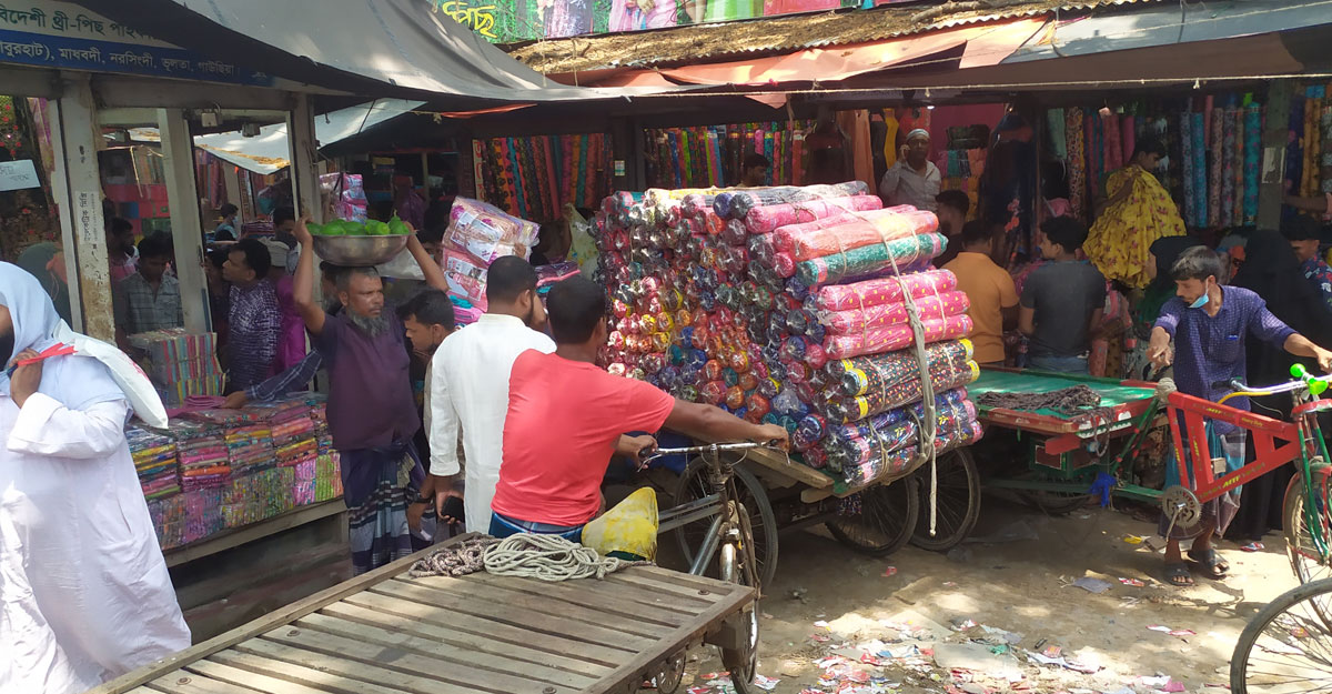 ঈদকে সামনে রেখে ক্রেতার পদচারণায় মুখর হয়ে উঠেছে দেশের অন্যতম পাইকারি কাপড়ের বাজার নরসিংদীর শেখেরচর-বাবুরহাট। করোনার ধাক্কা কাটিয়ে প্রায় দুই বছর পর বাজার জমজমাট হওয়ায় দুই হাজার কোটি টাকা বেচাকেনার আশা করছেন সংশ্লিষ্টরা।