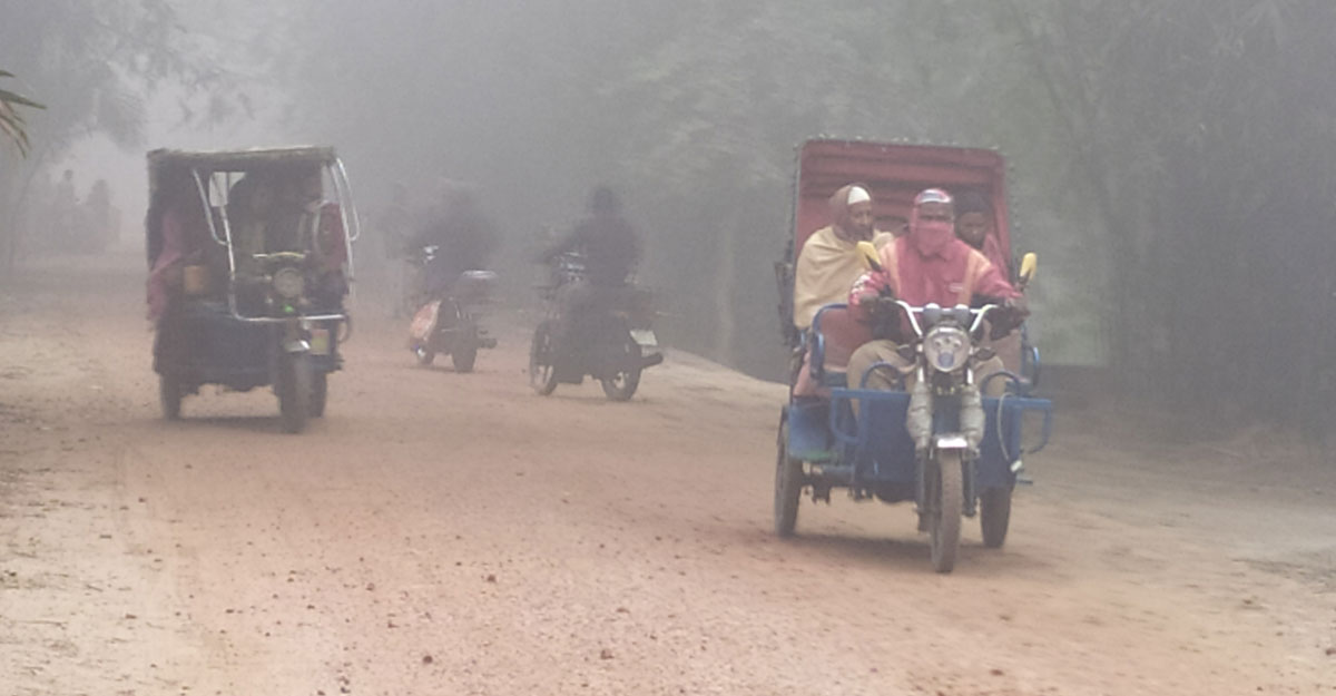 ঘন কুয়াশায় দূরের যানবাহন অস্পষ্ট দেখা যাচ্ছে