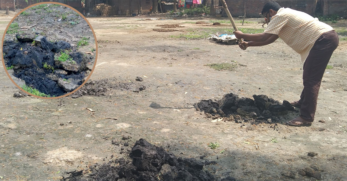 স্থানীয়দের এই অভিযোগের সত্যতা মেলাতে একজনকে কোদাল দিয়ে মাটিতে কোপ মারতে অনুরোধ করেন এই প্রতিবেদক। তখন মাটির চার থেকে পাঁচ ইঞ্চি নিচ থেকেও বেরিয়ে আসে ছাই।