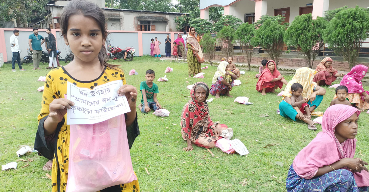 বৃহস্পতিবার (২৮ এপ্রিল) দুপুরে স্বেচ্ছাসেবী সংগঠন কৃষ্ণচূড়া ফাউন্ডেশনের ঈদসামগ্রী পেয়ে এসব কথা বলে শিশু সুমাইয়া (৭)। সুমাইয়ার মতো ঈদসামগ্রী নিতে জেলা শহরের একটি বেসরকারি কলেজে জড়ো হয়েছিল শতাধিক অসহায় মানুষ।