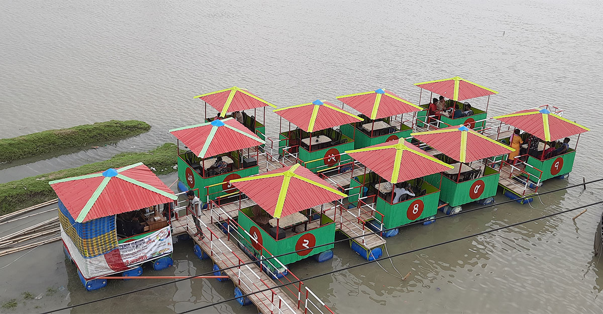 নদীতে স্রোত বইছে, সঙ্গে বাতাস। তীরে গড়ে ওঠা চরে ধীরে ধীরে বাড়ছে পানি, করছে ছুঁইছুঁই। এর সঙ্গে মাটি আঁকড়ে ধরে থাকা ১০০ প্লাস্টিকের ড্রাম ভেসে উঠছে। আর ড্রামের ওপর গড়ে তোলা সুসজ্জিত ১০ কক্ষবিশিষ্ট একটি রেস্টুরেন্টও ভেসে উঠছে পানির ওপর। মাঝেমধ্যে বাতাস বইলে বা নদীতে জলযান গেলে সৃষ্ট ঢেউয়ে দোল খাচ্ছে। মুহূর্তের মধ্যে শুকনা চরের বালু নদীর জোয়ারের পানিতে লুকিয়ে গেল।