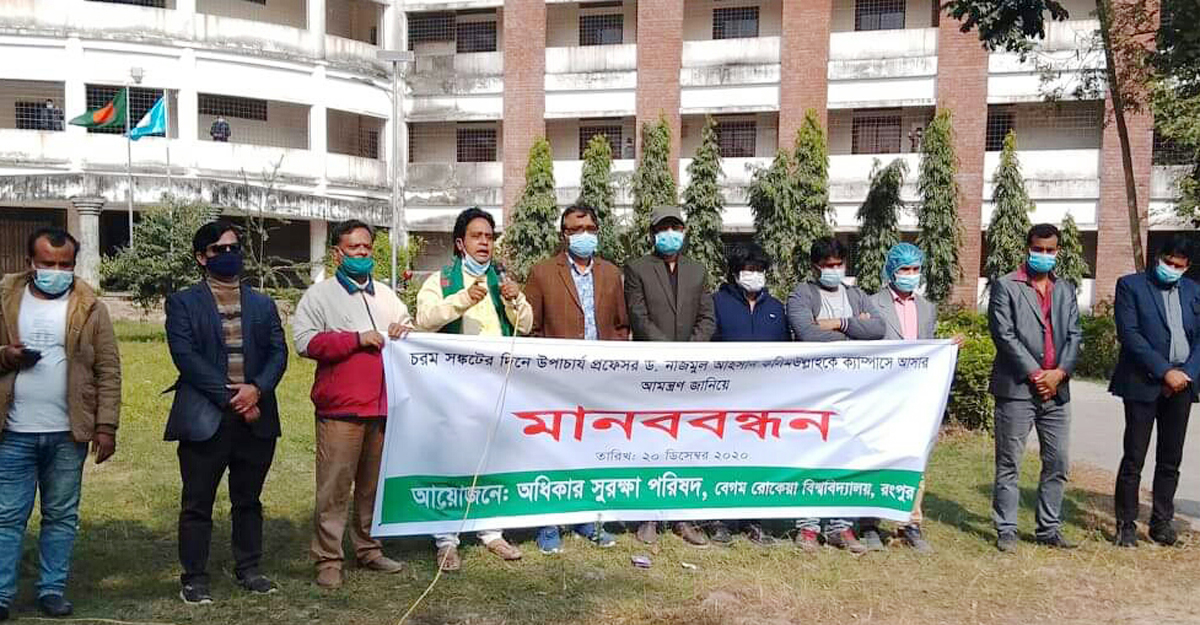 বেরোবি উপাচার্যকে ক্যাম্পাসে আমন্ত্রণ জানিয়ে শিক্ষক-কর্মকর্তাদের মানববন্ধন